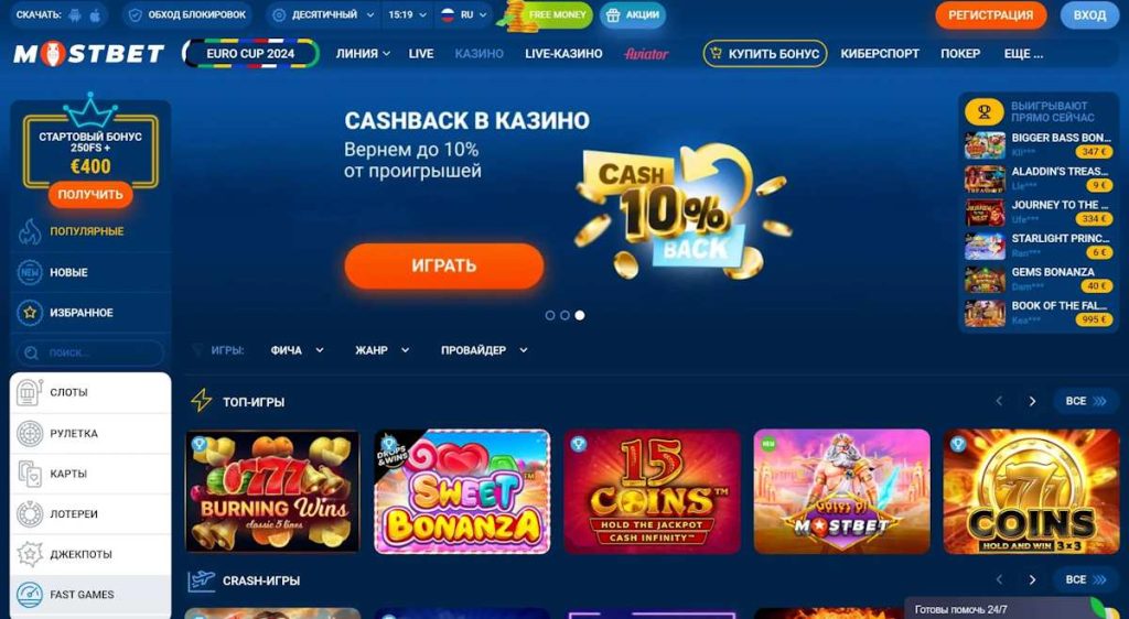 Онлайн-казино Mostbet располагает обширным каталогом азартных развлечений, где центральное место занимают игровые автоматы и видеослоты. Для удобства пользователей вся библиотека размещена в разделе «Казино», доступном через левое меню ресурса. После выбора этой категории открывается красочная страница, на которой представлены сотни игр разных жанров и направлений.